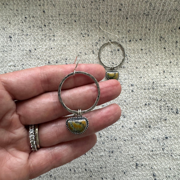 These hoops are handmade from start to finish. The Sterling Silver hoops are hammered to add texture and shimmer. The stones are Turquoise. The stones are a little different in size and color, they are natural stones. I added a beaded embellishment around the stones and I oxidized the silver to bring a darker more dramatic look to the embellishments.